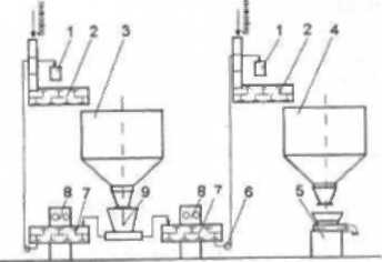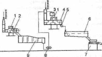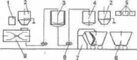 Рис. 6.23. Апаратурна схема порційного приготування тіста з житнього та житньо-пшеничного борошна на концентрованій молочнокислій заквасці вологістю 70%: 1 — водопідготовчий бачок, 2 — автоборошномір, 3 — ємкість для бродіння закваски з мішалкою і водяним підігрівом, 4 — напірна ємкість, 5 — дозатори (дріжджів, солі, закваски); 6 — діжа, 7 — тістомісильна машина, 8 — шестеренчастий насос, 9 — заварювальна машина