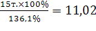 Определим расход муки идущий на выработку 15 тонн хлеба в сутки. Средний выход 136,1%.