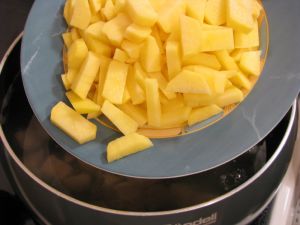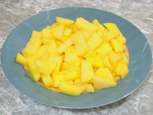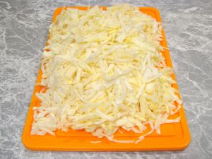 Технология приготовления: Порционные куски сырой рыбы, нарезанные под углом 30о из филе с кожей без костей, посыпают солью, кладут кожей вниз в смазанную маслом (2г от нормы) сковороду, сверху кладут ломтики отварного картофеля, заливают белым (на рыбном бульоне из пищевых отходов рыбы или воде) соусом, поливают сливочным маслом, посыпают сухарями и запекают в жарочном шкафу при температуре 240-250оС в течение 30-40 минут.