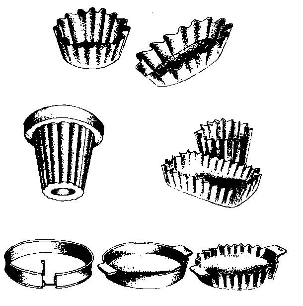 Металеві форми (Рис.6). Форми бувають товсті і тонкостінні. Для приготування таких солодких страв, як желе та креми, краще використовувати форми з тонкими стінками, бажано з отвором у центрі. У такій формі вміст застигає рівномірніше. Для борошняних та гарячих солодких страв (пудинги тощо), навпаки, форма повинна мати товсті стінки, бо в такому випадку вміст пропікається краще.