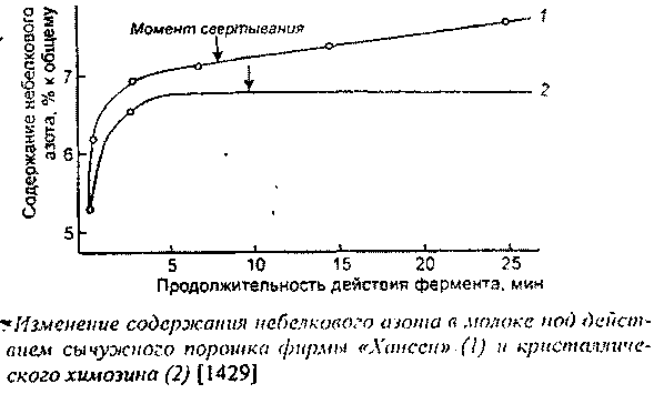В природе нет энзимов, катализирующих разрыв только связи Феню5-Метюб в χ -казеине, но молокосвертывающие энзимы должны расщеплять эту связь во много раз быстрее, чем другие связи в протеинах молока, так как весь χ-казеин должен быть гидролизован молокосвертывающими энзимами во время выработки сыра, иначе не произойдет коагуляция казеина или значительная часть казеина останется в сыворотке. Любая другая протеолитическая активность молокосвертывающих энзимов во время выработки сыра нежелательна, так как растворимые продукты протеолиза остаются в сыворотке, что снижает выход сыра. По-видимому, теряется для сыра и макропептид, отделяемый от х-казеина в результате гидролиза молокосвертывающими энзимами, но с этим нужно мириться, так как без гидролиза χ-казеина сычужный сыр выработать нельзя.
