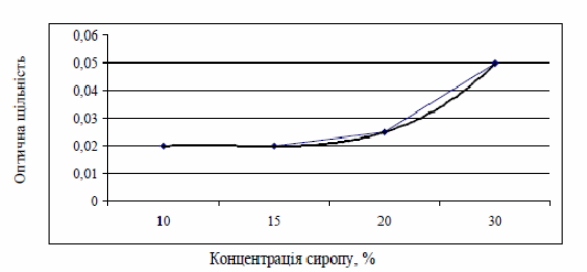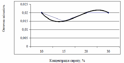 У сиропі зі збільшенням його концентрації збільшується оптична щільність забарвленого розчину, починаючи від концентрації 15 %, що подано на рисунку 5.