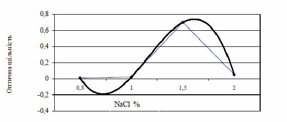 Згідно рисунка 3, у розчинах кухонної солі меланіновий барвник виявляє пароболічну залежність. Рівняння регресії має вигляд: