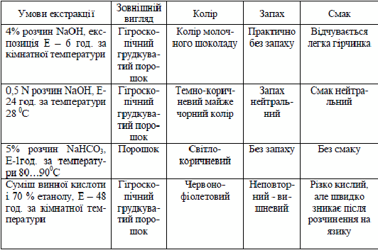 Згідно таблиці 1, виділений нами за опублікованими методиками барвник має різні органолептичні характеристики.