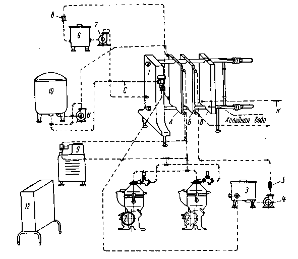 1 – пластинчатый пастеризатор; 2 – молокоочиститель ОМА-3М; 3 – балансировочный бак; 4 – центробежный насос для молока; 5 – регулятор потока; 6 – бойлер; 7 – насос для горячей воды; 8 – инжектор; 9 - гомогенизатор А1-ОГМ; 10 – выдерживатель пастеризованного молока Г6-ОПБ-1000; 11 – насос центробежный; 12 – щит управления