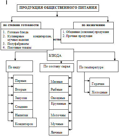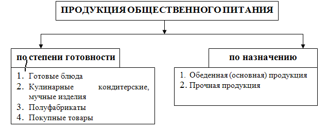 Продукция общественного питания – совокупность производимых и реализуемых блюд, кулинарных и кондитерских изделий, полуфабрикатов и готовых к потреблению продуктов предприятий пищевой промышленности и сельскохозяйственных производителей, т.е. в составе продукции выделяют продукцию собственного производства и покупные товары.