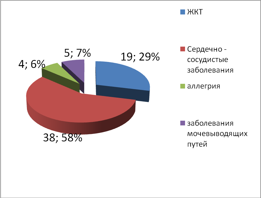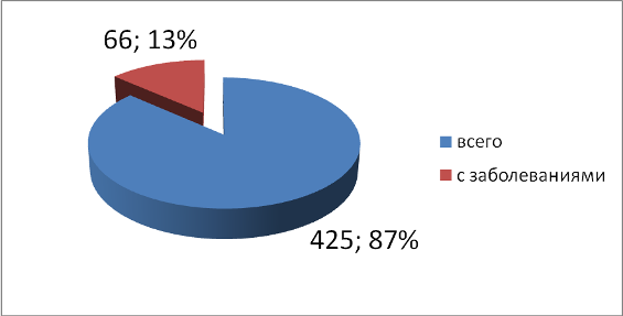 По результатам анализа медицинских карт обучающихся нашей школы, мы выявили, что в нашей школе 66 человек из 425 болеют хроническими заболеваниями, такими как: сердечнососудистые заболевания, аллергия, заболевания мочевыводящих путей, ЖКТ. Это составляет 13% обучающихся.