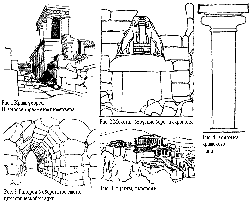 С критской культурой связано последующее развитие микенской культуры (1500—1200 гг. до н.э.). Претеснения греков вынудили жителей острова переселиться на материк и создать там укрепленные крепости (Микены и Тиринф). При сооружении их использовалась кладка толщиной в несколько метров из больших необработанных камней, называемая циклопической и выполненная, по преданиям греков, гигантами-циклопами (рис. 3).