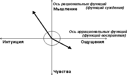 Таким образом, в целях данной классификации можно считать, что психика человека характеризуется двумя радиус-векторами в данной системе координат, причем один из них будет отображать две смежные доминирующие функции, а второй - две подавленные. Два радиус-вектора необходимы потому, что хотя система с двумя линиями осей и напоминает декартову прямоугольную систему координат, но в действительности она является четырехмерной (четырехкоординатной), так как противоположные функции качественно различны (на схеме этому соответствует четыре стрелки на осях - четыре направления количественного увеличения параметров).