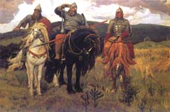 В соответствии с былинными образами Васнецов разработал характеры своих персонажей. В центре - Илья Муромец. Илья Муромец прост и могуч, в нем чувствуется спокойная уверенная сила и умудренность жизненным опытом. Сильный телом, он, несмотря на грозный вид - в одной руке, напряженно поднятой к глазам, у него палица, в другой копье, - исполнен "благости, великодушия и добродушия". Богатырь справа, самый младший, "напуском смелый" - Алеша Попович. Молодой красавец, полный отваги и смелости, он "душа-парень", большой выдумщик, певец и гусляр, в руках у него лук с копьем, а к седлу прикреплены гусли. Третий богатырь - Добрыня Никитич - в соответствии с былинами представителен и величав. Тонкие черты лица подчеркивают "вежество" Добрыни, его знания, культурность, вдумчивость и предусмотрительность. Он может выполнить самые сложные поручения, требующие изворотливости ума и дипломатического такта.
