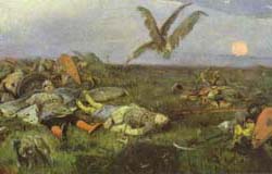 Темой картины было избрано поле после сражения и гибели полков Игоря Святославича, ставших богатырской заставой на рубежах родной земли, когда "пали стяги Игоревы и полегли русичи на поле незнаемом". Изобразительный ритм картины приближен к эпическому звучанию "Слова о полку Игореве". В трагическом пафосе смерти Васнецов хотел выразить величие и беззаветность чувств, создать просветленную трагедию. На поле битвы раскинулись тела не мертвых воинов, но, как в русском фольклоре, "вечно уснувших". В сдержанно строгих позах и лицах павших Васнецов акцентирует значительность и величавое спокойствие. Соответствует "Слову" и характер живописных образов, воссозданных Васнецовым. Они величавы и возвышенно героичны. Проникновенно-лирической нотой в торжественном строе картины звучит образ прекрасного отрока-княжича, навеянный описанием гибели юного князя Ростислава. Поэтическими строфами Слова о гибели мужественного Изяслава навеян образ покоящегося рядом богатыря - воплощение доблести и величия русского воинства. Для картины художник использовал все, что предстало перед ним в Историческом музее, когда он изучал здесь изукрашенные древние доспехи, вооружение, одежду. Их формы, узорчатость и орнаментация создают на васнецовском полотне красивые добавочные мотивы декоративной композиции, помогающие передать аромат былинного сказа.