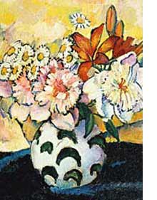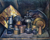 Машков Илья Иванович (1881 – 1944 гг.) был одним из наиболее значительных и в то же время самых характерных живописцев круга «Бубнового валета». По мнению М Волошина, «наиболее живописец из всех "Валетов", пожалуй, Илья Машков. Ему ближе всех знакомы масляные краски, и они ему повинуются». Уже в ранних произведениях Машкова проявилось его замечательное умение строить форму цветом – плотным, сильным, выразительно раскрывающим материальную плоть мира. В отличие от ряда других «бубновалетцев», влияния западного авангарда влекли его не столько к кубизму с его сдержанными тональностями, а к фовизму. Фовистская красочная стихия господствует в его портретах конца 1900 – начала 1910-х годов (Мальчик в расписной рубашке, 1909 г.; Дама с фазанами (Ф.Я.Гессе), 1911 г.; оба – в Русском музее), порой сочетаясь с чувством гордого самоутверждения (Автопортрет с П.П. Кончаловским, 1910 г., частное собрание, Петербург). Яркой, но в то же время и конструктивно - четкой декоративностью выделяются его натюрморты (Ягоды на фоне красного подноса, 1910–1911 гг., Русский музей). Художник охотно использует приемы примитива и изо-фольклора (живопись вывесок и подносов), благодаря чему смысловые планы гротескно смещаются, и, к примеру, чучела фазанов в портрете Гессе кажутся не менее «живыми», чем сама дама. Игровое, отчасти «протофутуристическое» начало, присущее раннему творчеству Машкова, с годами стихает. Примкнув в 1924 году к традиционалистам АХРР, он придает своим композициям более академичный, классически уравновешенный вид. Известные его «парадные натюрморты» со «снедью московской» – Хлебы и Мясо и дичь (оба – 1924 г., ГТГ) – воспринимались как красочные символы сравнительного благополучия и сытости, наступивших в годы НЭПа. Плодотворно работал как живописец и позже, вместе с тем с годами как бы отступая в тень официально - выставочной жизни. Прославился и как педагог, завел свою школу - студию уже в 1902 г.; преподавал в ней, а в 1918 - 1930 гг. – во ВХУТЕМАСе (Высшие художественно - технические мастерские).