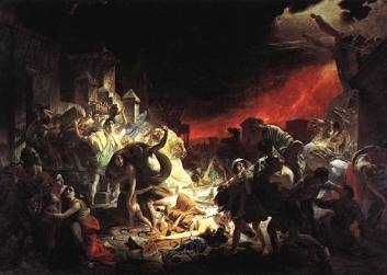 Обуреваемый жаждой большой исторической темы, в 1830, побывав на месте раскопок древнего города, Брюллов начинает работу над полотном "Последний день Помпеи". Результатом становится величественная "картина-катастрофа" (завершенная в 1833 и хранящаяся в Русском музее), которая иконографически примыкает к целому ряду родственных по духу произведений мастеров романтизма (Т. Жерико, У. Тернера и др.) — произведений, возникающих по мере того, как череда политических потрясений, вызванных начальным сейсмическим импульсом Великой французской революции, охватывает разные страны Европы. Трагический пафос картины усиливается бурной пластической экспрессией фигур и резкими светотеневыми контрастами. Брюллову удалось изобразить охваченную единым порывом толпу граждан в роковой момент ее исторического бытия, создав тем самым первый пример той многофигурной исторической картины-итога, которую вся русская живопись 19 века осознавала в качестве своей сверхзадачи.