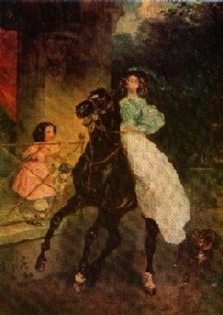 Выехав в Италию как пенсионер Общества поощрения художеств, жил и работал там в 1823-35. Впечатления "полуденного края", его природы и искусства помогли молодому Брюллову претворить опыт академического классицизма, учебного копирования антиков в живые образы, полные чувственного обаяния. Уже для ранних картин художника характерны виртуозный рисунок и композиция, эмоциональный, теплый колорит ("Итальянский полдень", 1827, Русский музей; "Вирсавия", 1832, Третьяковская галерея). Он выступает и как мастер светского портрета, превращая натурный мотив в образец райски идиллической гармонии ("Всадница (Дж. и А. Паччини)", 1832, там же).