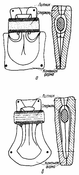 Особенно высокого развития достигло литейное ремесло на территории древней Грузии в период средней: бронзы. Хотя по-прежнему основными литыми изделиями оставались топоры и разного вида оружие, но наряду с ними изготовляется большое количество разнообразных украшений.Хорошо зарекомендовавшая себя ранее каменная литейная форма для отливок простой конфигурации остается основной и в этот период, но мастера Грузии умело используют большие ее возможности. Разнообразные варианты изготовления каменных форм относятся ко II тысячелетию до н. э. Применяются формы не только с горизонтальным, но и с вертикальным разъемами (рис. 3), что требовало уже тщательной и точной подгонки. Выбор положения формы при заливке, а также рациональное устройство литниковой системы (верхний подвод в массивную часть формы через увеличенный литник) — свидетельство высокой техники литья. Об этом также говорят отливки в сложных формах, полученных по выплавляемым моделям, и применение глиняных стержней в каменных формах.