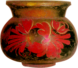 На одной из братин крупными темпераментными мазками написан красный цветок, свободно раскинувший лепестки и листья. Художник смело перекинул с черного фона на золотой мелкие лепестки, и золото засверкало еще ярче от упавших на него огненных мазков киновари. Белильные оживки, искусно брошенные на самые крупные лепестки, еще более выделяют его на черном фоне. В этом орнаменте восхищает не только виртуозное мастерство росписи, но и поэтичность созданного образа, заставляющего вспомнить сказочный, приносящий счастье красный цветок, который, как рассказывают предания, можно увидеть только в ночь накануне Ивана Купалы.