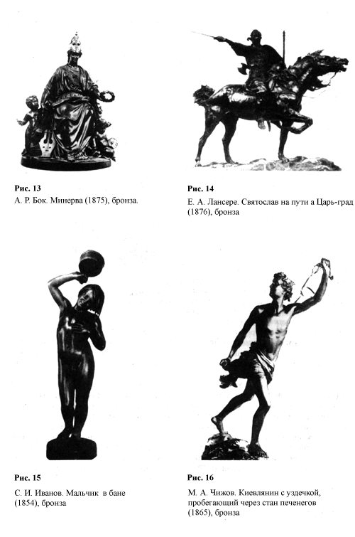 вгений Александрович Лансере (1848 — 1886) выполнял небольшие жанровые статуэтки и группы (преимущественно изображения животных), а также сценки из быта русских крестьян и народов Кавказа и Средней Азии, в которых проявлял большую наблюдательность и мастерство передачи жестов людей и повадок животных (рис. 14). Скульптурно оформлял произведения декоративно-прикладного искусства (чернильницы, подсвечники и др.). Ряд работ Лансере был предназначен для тиражирования на Каслинском чугунолитейном заводе. Лансере создано свыше 400 оригинальных отливок.Во второй половине XIX в. скульптура как бы отходит на второй план после живописи, что особенно относится к литой монументальной и декоративной скульптуре. Это вызвано протестом художников против академической системы преподавания — творить только на отвлеченные мифологические темы. Среди первых скульпторов, обратившихся к бытовому жанру, были С. И. Иванов, М. А. Чижов, В. А. Беклемишев, М. М. Антокольский и др.