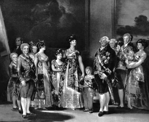 Таково было положение дел, когда король заказал Гойе написать групповой портрет королевской семьи. Предварительно Гойе сделал эскизы отдельных членов семьи, а затем приступил к групповому портрету и завершил его очень быстро. В течении года картина была закончена. Мы видим роскошные костюмы, блестящие драгоценностями и королевскими регалиями, однако лица царственной четы свидетельствуют об удручающем отсутствии характера .Скучные невыразительные физиономии роскошно одетых короля и королевы заставляют вспомнить высказывание Теофиля Готье: они напоминают "булочника с женой , которые крупный выигрыш в лотерею. "