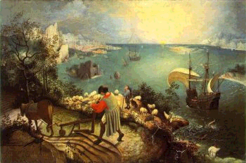 Шестнадцатый век принес с собой новое отношение к миру. Под воздействием естественнонаучных теорий Коперника и великих географических открытий впервые возникло представление о необъятности вселенной; вместе с тем родилось сознание ничтожества человека на фоне этих грандиозных пространств. Отзвуком размышлений художника о смысле человеческой и природно-вселенской жизни была картина "Падение Икара". Гибель античного героя, дерзновенно устремившегося к солнцу, оказывается тут мелким эпизодом; Брейгель изображает лишь торчащие вдали из воды ноги Икара, канувшего в море. В центре внимания - пронизанный солнечным светом, исполненный величия морской пейзаж и сцены мирного сельского труда на переднем плане. В этом произведении закладываются основы миропонимания, которое получает развитие в дальнейшем творчестве Брейгеля. Только в согласии с природой, постигая ее могучий мировой ритм, может добиться успеха человек - иначе его усилия обречены, подобно усилиям тщеславного Икара.