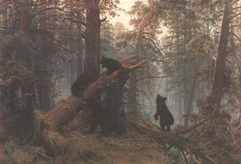 Занимательный жанровый мотив, введенный в картину, во многом способствовал ее популярности, но истинной ценностью произведения явилось прекрасно выраженное состояние природы. Это не просто глухой сосновый лес, а именно утро в лесу с его еще не рассеявшимся туманом, с легко порозовевшими вершинами громадных сосен, холодными тенями в чащах. Чувствуется глубина оврага, глушь. Присутствие медвежьего семейства, расположившегося на краю этого оврага, порождает у зрителя ощущение отдаленности и глухости дикого леса.