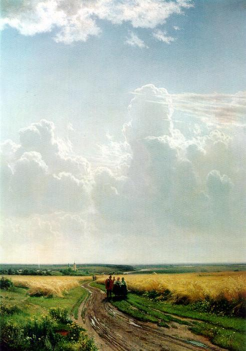Две трети верхней части картины занимает небо, в котором клубятся пронизанные светом солнца облака, только что пролившие дождь на поспевающую золотую ниву, на дорогу, по которой навстречу зрителю идет группа крестьян, на село, виднеющееся вдали, – там сады, колокольня храма, блестящий изгиб реки, потом еще дали и леса... А на первом плане – любовно выписанные цветы. На этой картине возникает тема будущего полотна – то же золото благодатно уродившегося хлеба, рассеченное проселочной дорогой ("Рожь"). "Этот лирический пейзаж, – пишет В. Манин, – редкий в творчестве художника, ставит его в ряды зачинателей национального пейзажа"