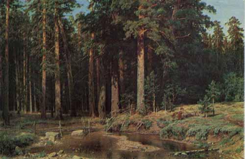 Как откровения новой русской пейзажной живописи, противостоящей мертвому догматизму академической школы, были восприняты картины Шишкина, показанные на первых выставках передвижников. "Сосновый бор" (1872)-это "портрет" досконально изученного прикамского леса, где вырос сам художник. Портрет, глубоко правдивый как в общей формуле, так и в мелких частностях, портрет торжественный по своему строю, требующий известной зрительской дистанции и в то же время откровенно личный по отношению к объекту. При характеристике произведений Шишкина выявляется их нерасторжимая художественная целостность, в них одно качество не существует без другого. Так, в его полотнах не выглядят диссонансами ни порхающие бабочки на фоне могучего корабельного леса, ни медведи, взирающие с вожделением на дерево с ульем в сосновом бору, или полевые цветы, пестрящие золотое море ржи и написанные с благоговейным вниманием.