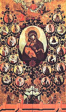 В центре иконы - образ Владимирской Божией Матери - святыни русских князей. Икона увита виноградной лозой, в ветвях которой Ушаков разместил образы русских святых, помогавших молитвой и личным участием мирному объединению русских земель.