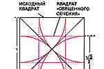"СВЯЩЕННОЕ СЕЧЕНИЕ" исходного квадрата получается путем проведения дуг окружностей (с центрами в углах квадрата), проходящих через центр квадрата (вверху). Соединяя точки пересечения дуг со сторонами квадрата, можно получить сетку, делящую квадрат на девять частей; центральный квадрат называется квадратом "священного сечения". Длина каждой дуги AB равна, с точностью до 0,6 %, длине диагонали CD прямоугольника, составляющего половину исходного квадрата (в центре). Метод "священного сечения" позволяет приблизительно решить задачу спрямления окружности: периметр квадрата, образованного из четырех отрезков CD, примерно равен длине окружности, образованной из четырех дуг "священного сечения" (внизу). |