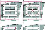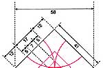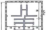 ПЛАНИРОВКА ЖИЛИЩ в дворовых зданиях определяется "священными сечениями" квадрата, длина стороны которого равна 41 римскому футу, а диагональ равна внутренней (между внутренними поверхностями наружных стен) ширине зданий (58 футов). На плане показаны два прилегающих друг к другу жилища, разделенных общей стеной толщиной 2 фута. Размеры жилищ определяются последовательными "священными сечениями". Наиболее часто встречается число 7 и его кратные. |