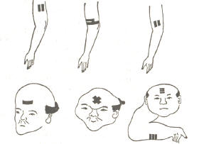 Достаточно полные сведения о применении татуировок мы имеем приблизительно с XVII века, когда японцы вовсю заговорили не только об «изящном». Источники сообщают, что в это время в разных районах Японии преступников стали отделять с помощью татуировок от остального законопослушного населения. И причем в разных провинциях и княжествах метили по-разному. Это могла быть и собака на лбу (в весьма бедном словаре японских ругательств «собака» — одно из самых страшных); и круг на левом плече; и двойная линия вокруг бицепсов левой руки (за каждое следующее преступление прибавлялось по линии) и иероглиф «аку» — «злодей». Так что сразу же можно было без труда определить, какое и сколько было совершено преступлений. А чаще всего такая татуировка наносилась на внутренней поверхности рук.