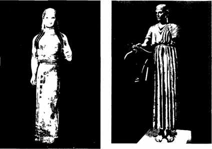 Если в скульптурном изображении мужской фигуры решалась проблема обнаженного тела, то в женской — проблема задрапированного. Такие фигуры назывались «корами» (по-гречески кора — дева). Чаще всего их находят около Афин, так как коры обычно изображали жриц богини Афины. Уже в ранних архаических корах видно, как скульптор стремился под их одеждой — хитонами и пеплосом — как можно точнее промоделировать тело. Глаза удлиненные, широко раскрытые, «архаическая улыбка» еле намечена.
