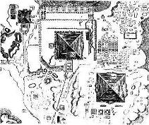 Центром этого ансамбля служила пирамида, с севера и юга были построены дворцы и поминальные храмы.