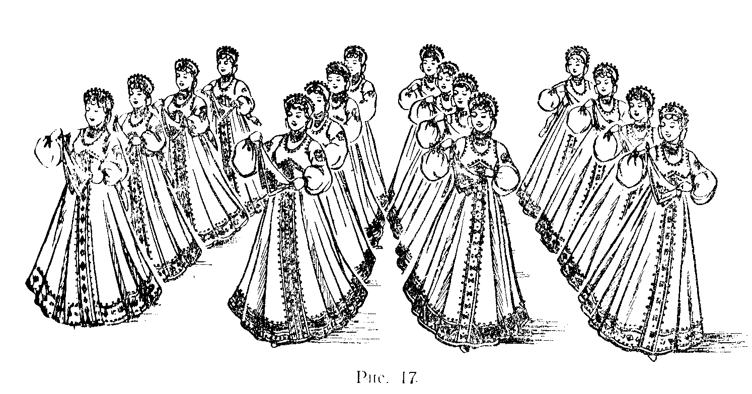 13-й—16-й такты Четыре пары на правой стороне сцены и четыре пары на левой стороне сцены, берясь за руки, образовывают два круга. Круги вертятся: правый — против часовой стрелки, левый — по часовой стрелке. К концу 16-го такта круги разрываются и образовываются опять две линии, в которых исполнители стоят лицом друг к другу, в профиль к зрителю.