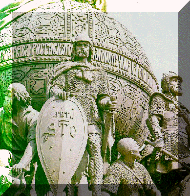 С южной стороны, в направлении Киева стоит Рюрик в остроконечном шлеме с остроконечным щитом, в звериной шкуре, наброшенной на плечи. На щите надпись: "Лета 6370". (До Петровского времени летосчисление в России велось от "сотворения мира", по современному календарю это 862 год, легендарная дата появления Рюрика в Новгороде.) Характерно, что Рюрику приданы черты не варяжского, а славянского воина. В сущности, Микешин отходит здесь от официально бытовавшей в ту пору так называемой "норманнской теории" (согласно которой русские якобы неспособны к самостоятельному развитию и наше государство создано пришельцами-норманнами, варягами; характерно, что эту теорию всякий раз берут на вооружение враги нашей страны - так было в прошлом, так остается и поныне). Лицо Рюрика, его оружие, одежда - все это подчеркнуто русское, славянское. Перед нами молодой и отважный русский воин, собравшийся в поход. Взгляд его, обращенный на просторы Ильменя, прям и смел, черты лица исполнены мужества и благородства. Кажется, он только что послал своему противнику гонца с берестой, на которой три коротких слова: "Иду на вы"... Слова эти летопись вложила в уста киевского князя Святослава. Пусть так. Но в них выражено нечто общее, типичное для всех прославленных русских витязей: открытая отвага, прямая честь.