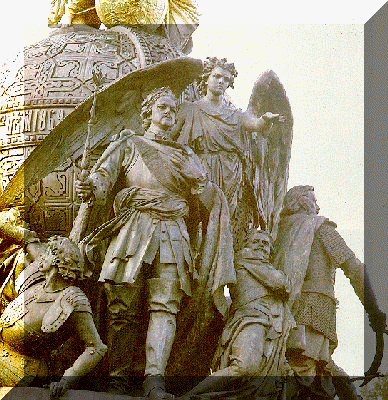 подносящая князю ребенка для крещения. Еще одна группа, в центре которой изображен Дмитрии Донской, попирающий ногой поверженного татарского воина, посвящена Куликовской битве. На восточной стороне помещена композиция из пяти фигур, символизирующих этапные события создания единого русского централизованного государства. Здесь Иван III в шапке Мономаха со скипетром и державой в руках, а также царь Михаил Федорович в окружении Минина и Пожарского, спасших Россию от польской экспансии. Композицию вокруг державы замыкает помещенное на парадной северной стороне изображение Петра I, который выделяется на фоне больших распростертых крыльев гения Славы, указующего новый путь России.