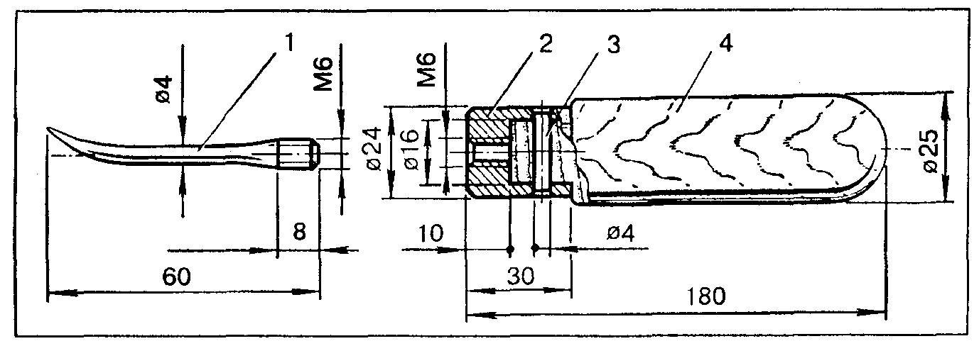 Довжина ручки (4, рис. 2) дорівнює 18—20 см, її діаметр — 20—25 мм. Після виготовлення ручки її обробляють таким чином: