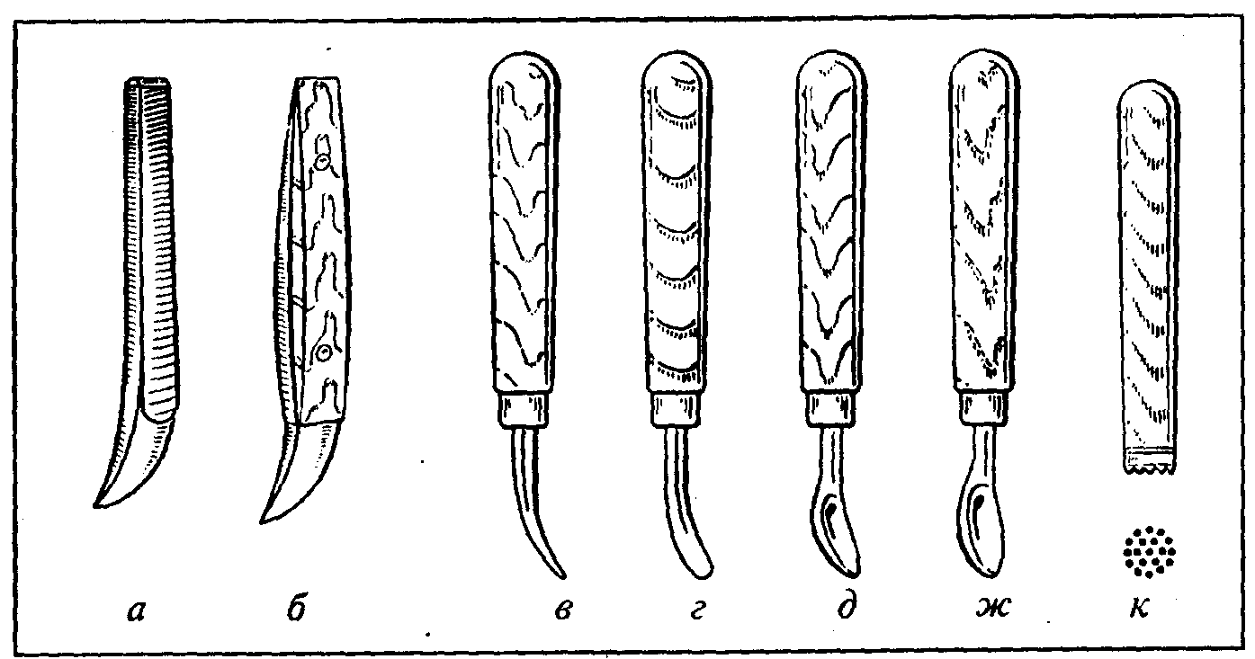 Рис. 1. Інструменти для металопластики: а, б — чекани-давильники «утюжки»; в — штихель; г — стека; д, ж — шпатель; к — чекан-пуансон.