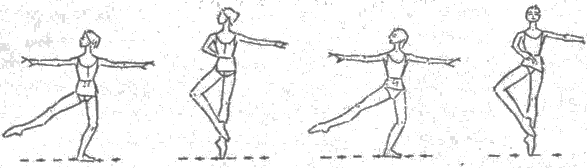 Раз-и следующего такта – вместе с поворотом еn fасе, левая нога начинает dеmi-рlie, одновременно правая нога, сгибаясь, поднимается до колена левой ноги. Левая рука опускается в I позицию, правая сохраняет II позицию, голова поворачивается еn fасе.