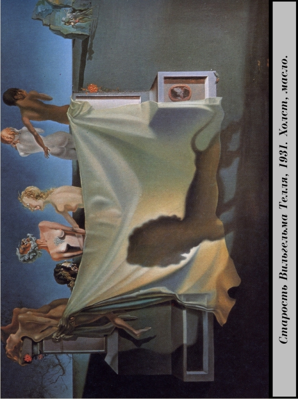 Нехватка денег не оказывала никакого видимого воздействия на Дали, который как раз тем летом написал некоторые самые выдающиеся свои картины. Теперь, твердо обосновавшись в том пейзаже, который он любил, Дали, казалось, нисколько не был взволнован тем, что ему запрещалось видеться с семьей и близкими друзьями, ровно, как и тем, что его отец бессильно таился по другую сторону разделявшего их мыса, в Кадакесе. Но его картины того времени рассказывают совершенно иное. Он начал разрабатывать историю Вильгельма Телля, которая для Дали была историей о грозной личности отца, чья цель, сознательная или подсознательная, состояла в кастрации сына. В картине "Старость Вильгельма Телля", которую Робер Дешарн датирует 1931 годом, но которая была начата предшествующим летом, отец преследует пару Дали-Гала, присутствующую на этом полотне трижды: сначала замерев в тесном объятии, затем, справа, в позе, настойчиво напоминающей об Адаме с Евой и их изгнании из рая, и наконец, где-то совсем вдали, очевидно, что в процессе превращения в камни Порт-Льигата. Отец Дали изображается как бородатый гермафродит, а женщина рядом с ним, кажется, мастурбирует его, но ее рука скрыта позади полупрозрачного листа, на который падает тень льва – символа страха и мучений в бестиарии Дали. Если считать картины Дали скорее автобиографическими по своему содержанию, нежели строго сюрреалистическими, то "Старость Вильгельма Телля" являет собой очень хороший пример способа, каким художник использовал живопись для изгнания из себя проблем отношений с отцом, которая иначе превратилось бы в нечто совершенно неразрешимое и нерассасывающееся.