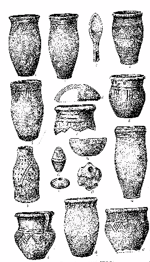 Другою поширеною формою посуду є горщики, що мають звичайно більш шорстку поверхню. Шийка таких посудин трохи звужена, вінця короткі, вiдiгнутi назовні; стінки поступово звужуються до плоского, досить широкого денця. Орнаментовані горщики звичайно надколами, розміщеними під вiнцями зовні або зсередини посудини.