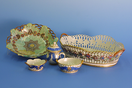Из фарфора делали чайные и кофейные сервизы и штучную посуду: блюдца, кукольные, чайные приборы, сахарницы, сливочницы, стаканы, чашки, чайники. Одновременно в производстве находилось до 20 фасонов чайных сервизов. Из фаянса изготавливались столовые сервизы и штучная посуда: блюда, икорницы, кружки, салатники, сухарницы, тарелки, фруктовницы, чашки и пр. Из майолики делали скульптуру, пепельницы, кувшины, вазы, кружки (рис. 11), корзины для фруктов, горшки цветочные (рис. 12), сливочницы, зеркала, табуреты, бочонки, подсвечники, чернильницы, курительные приборы.