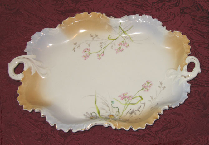 Для массового фарфора использовались приемы плоской росписи несложными мотивами растительного орнамента. Это и цветки розы, и ромашки, а также непременное добавление усиков и веточек ("рокачек").