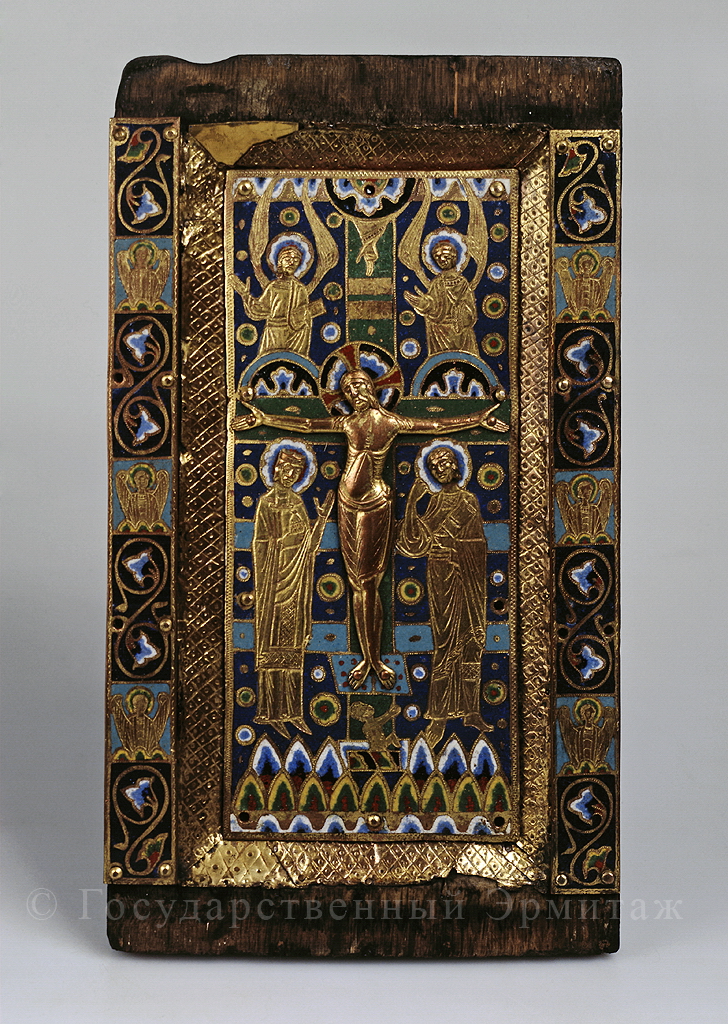 Доска от книжного переплета с изображением сцены Распятия. Доска от переплета является типичным примером продукции лиможских мастерских. Подобные доски служили верхними крышками переплетов, а на нижних помещалась композиция "Христос во славе" в окружении символов евангелистов. Особенностями данного памятника являются накладные головы фигур, отличающиеся от типовых "классицизирующих" голов (возможно, они были добавлены позднее) и необычный предмет в руках Мадонны - вероятно, сосуд для священных масел, более характерный для иконографии Марии Магдалины.