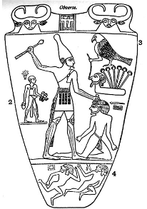 Что касается иероглифики – священного письма, то лучшей иллюстрацией может служить таблица Нармера (изображена на рисунке 4). Изображение сокола, который держит в лапе веревку, протянутую через ноздри лежащего на земле человека с растущими из прямоугольника-тела шестью стеблями тростника, является записью о том, что фараон (его символизирует сокол, это один из древнейших образов царя и бога Гора) захватил в плен шесть тысяч пленников (пленник изображен с максимальной наглядностью, каждый стебель тростника обозначает число «1000»).