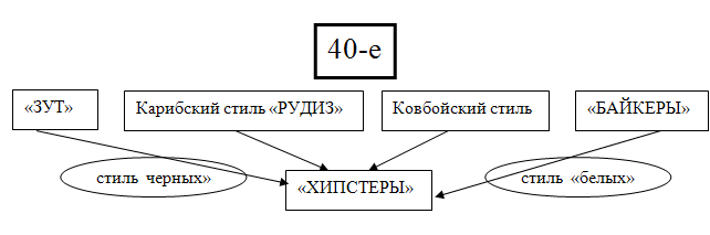Таким образом, в конце сороковых годов окончательно оформились два стиля, определявших впоследствии лицо молодежных субкультур - карибский, стиль «черных» городских субкультур как и в Америке, так и в Великобритании; «вест» или «ковбойский», определивший пути «альтернативного» поиска большинства белых представителей молодежных субкультур.