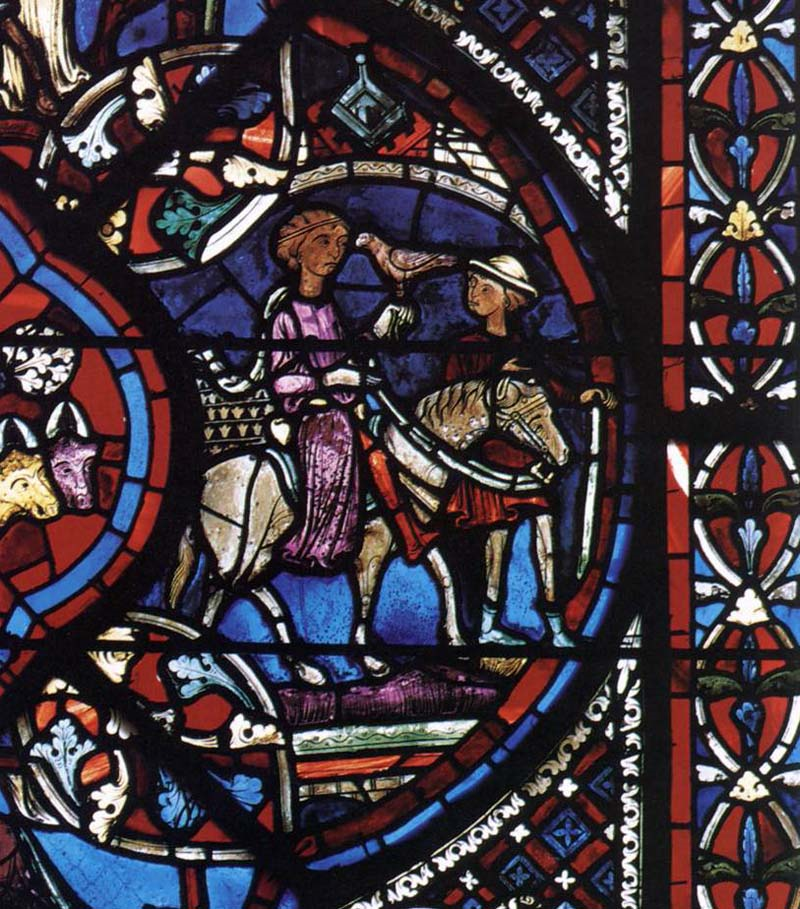 На витраже «Святой Евстафий», расположенном на северном нефе собора в Шартре, изображен мир средневековой знати. Основным цветом палитры декоративных областей витража, как и в Бурже, являются красный и синий. А цвета, используемые в сюжетных композициях, уже другие - зеленый, фиолетовый, белый и желтый. На первой сцене изображен святой Евстафий, выезжающий на охоту. Здесь же изображен олень, пытающийся спастись от охотников. Витражисту удается подчеркнуть мощное телосложение всадников, оперируя линиями контуров и сочетаниями тонов драпировки одежд.