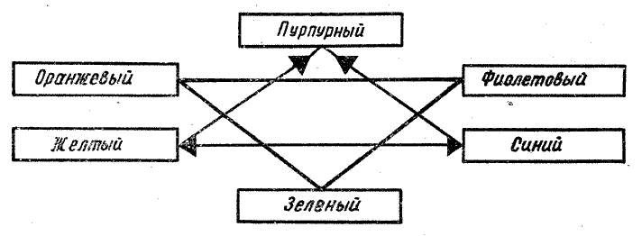 Его «Учение о цветах» – сочинение о норме цветовой гармонии. У Гете каждый цвет - это сгусток эмоциональной сущности, имеющий свой темперамент и по-разному проявляющийся в столкновении с другими цветами. Эмоциональные реакции на эти взаимоотношения являются эстетической основой цветовой гармонии. По Гете основных цветов устанавливалось шесть с образованием двух цветовых треугольников (рис. 1). Два цвета - желтый и синий располагались по горизонтали - первая «характерная пара». Она являлась основанием первого цветового треугольника, на вершине которого Гете утверждал пурпурный цвет. Над желто-синей он располагал вторую «характерную пару» - оранжево-фиолетовую и вниз от этого основания строил второй цветовой треугольник, вершина которого отводилась «плебейскому» зеленому цвету. Таким построением Гете впервые установили иерархию гармонических взаимосвязей в своем шестицветном круге. [И.В. Гете 1996: 286]