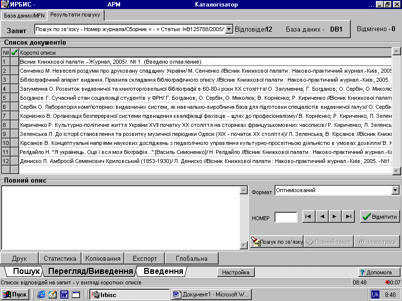 Створення розгалуженого довідково-бібліографічного апарату, електронного каталогу бібліотеки на основі автоматизованої бібліотечної інформаційної системи ІРБІС; системи пошуку інформації.