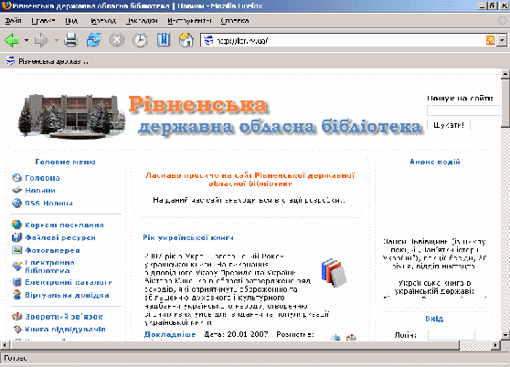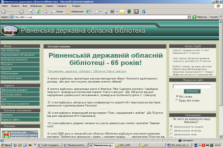 Важливим інструментарієм інформаційного комплексу бібліотеки є Веб – сайт, який популяризує ресурси книгозбірні в мережі Інтернет, надає доступ віддаленим користувачам до електронних каталогів, електронних повнотекстових баз даних, неопублікованих документів, які створюють працівники бібліотеки. Приємний інтерфейс, зручна навігація дають можливість оперативно здійснювати пошук інформації як на сайті, так і в бібліотеках регіону, Хостинг для яких надає РДОБ, інших пошукових системах