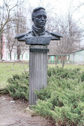 Каменная стела, бюст, медь. Скульптор - Поляков В. П., архитектор - Лазарев А. Г.